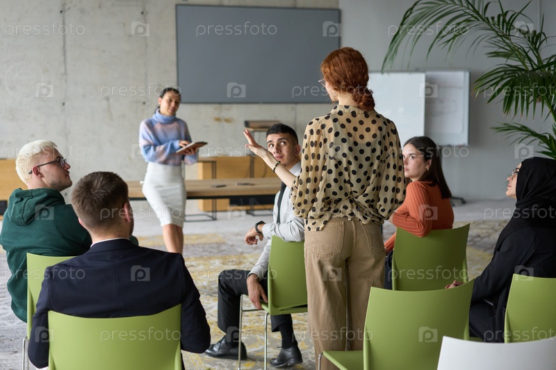 Группа разнообразных деловых людей сосредоточенно сидит в современном офисе, активно участвуя в обучающем занятии под руководством инструктора, уделяя особое внимание последним технологическим достижениям в мире бизнеса