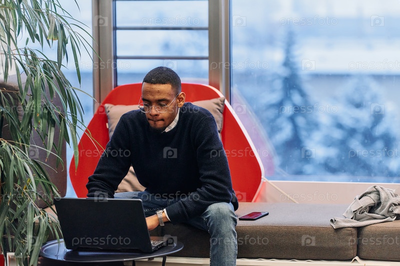 Сверхурочная работа. Афроамериканец с закрытыми глазами отдыхает на работе за ноутбуком. Уставший программист-мужчина отдыхает из-за сверхурочной работы