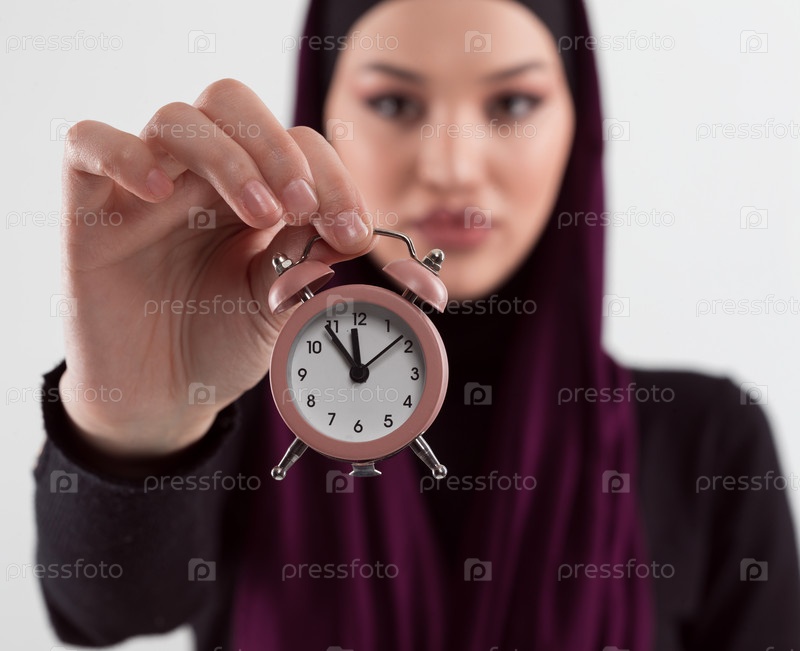 Красивая арабская бизнесвумен в хиджабе и держит маленькие часы. Время идет, и это концепция давления