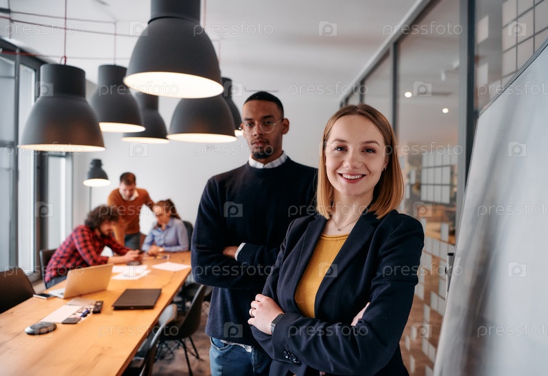 Динамичный лидерский дуэт: светловолосый директор и молодой афроамериканский предприниматель в офисной обстановке