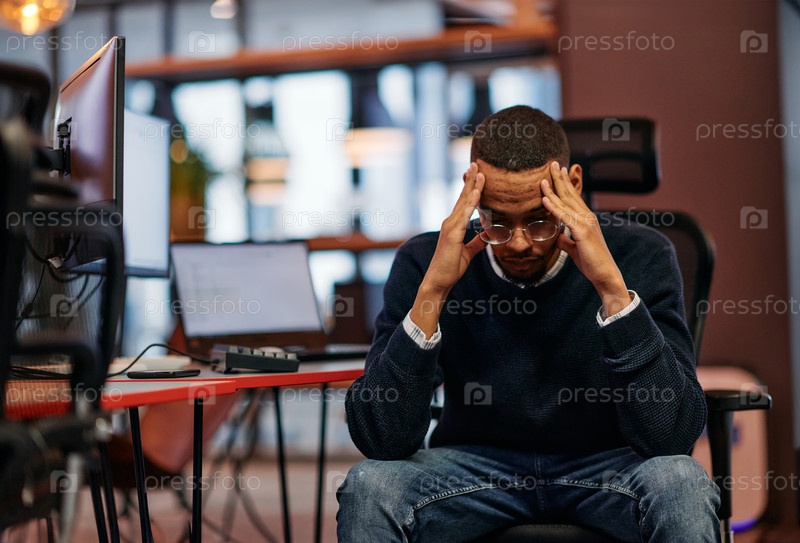 Измученный афроамериканский программист отдыхает на работе