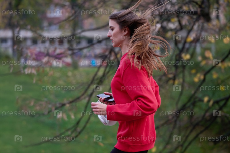 Молодая красивая женщина бежит в осеннем парке и слушает музыку в наушниках на смартфоне