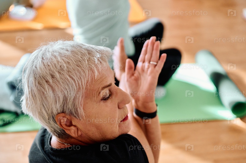 В залитом солнцем помещении пожилая женщина грациозно занимается омолаживающей йогой, уделяя особое внимание растяжке шеи, спины и ног, воплощая спокойствие и благополучие