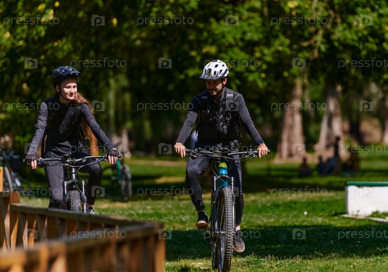 Счастливая пара, одетая в профессиональную велосипедную экипировку, наслаждается романтической велопрогулкой по парку, окруженному современными природными достопримечательностями, излучая любовь и счастье