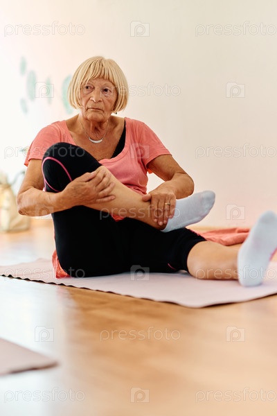 В залитом солнцем помещении пожилая женщина грациозно занимается омолаживающей йогой, уделяя особое внимание растяжке шеи, спины и ног, воплощая спокойствие и благополучие