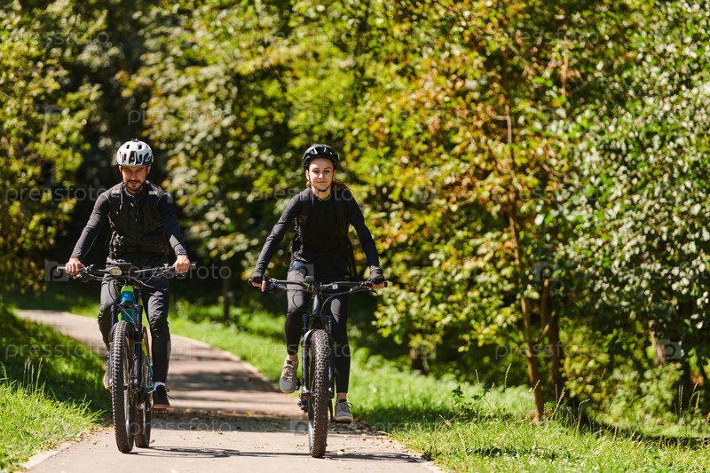 Счастливая пара, одетая в профессиональную велосипедную экипировку, наслаждается романтической велопрогулкой по парку, окруженному современными природными достопримечательностями, излучая любовь и счастье