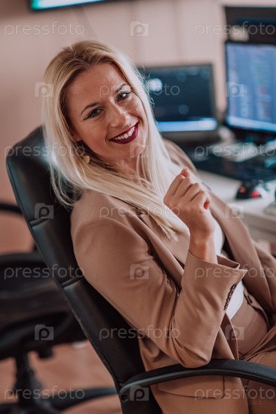 Бизнес-леди сидит в офисе программиста в окружении компьютеров, демонстрируя свою компетентность и преданность технологиям