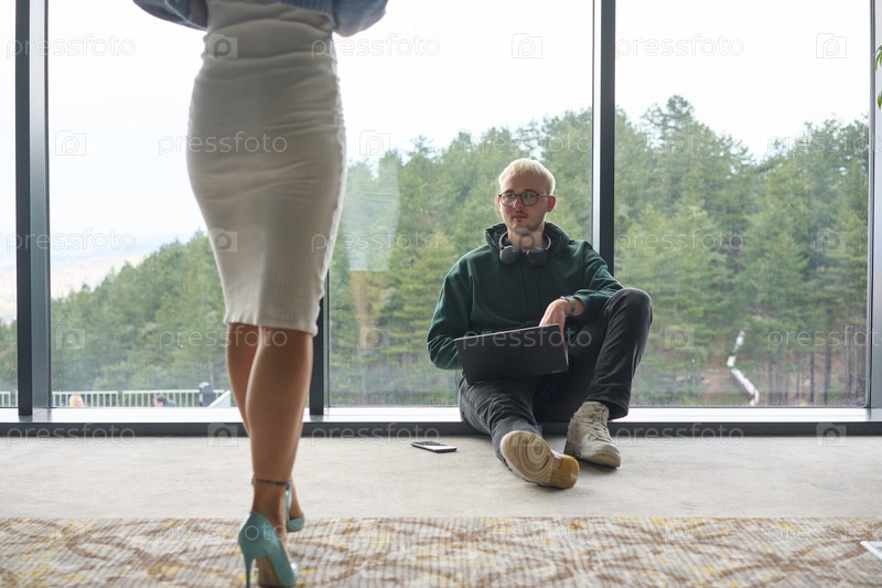 Светловолосый мужчина небрежно сидит на полу современного офиса, прислонившись к окну, и работает за ноутбуком, а его привлекательная коллега стоит рядом