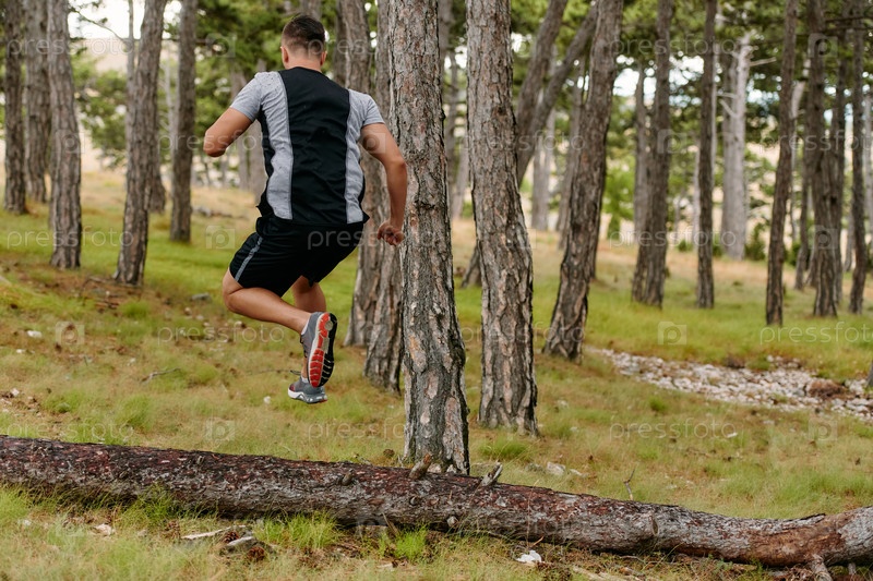 Решительный мужчина преодолевает лесные препятствия с помощью упорства и скорости