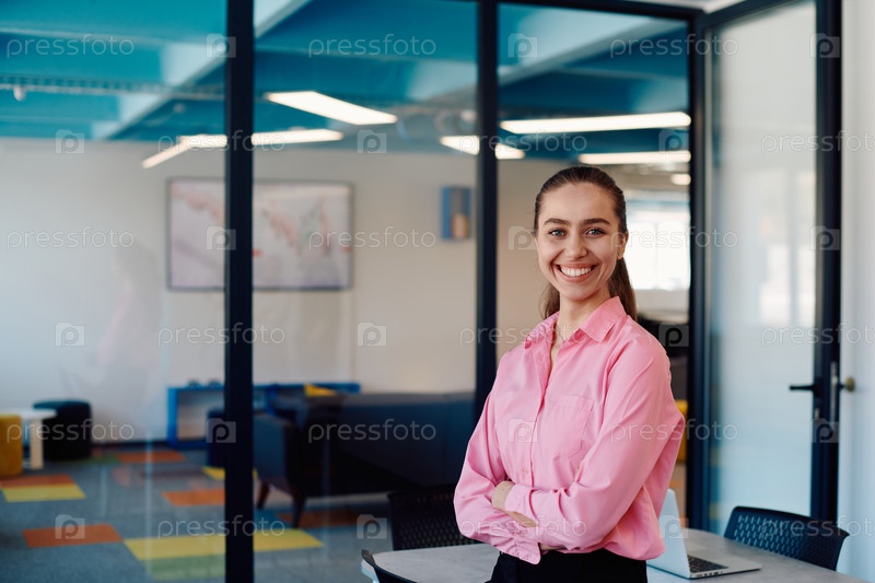 Портрет деловой женщины в креативном открытом пространстве коворкинга стартап-офиса со скрещенными руками. Успешная бизнес-леди стоит в офисе с копирайтом. На заднем плане работают коллеги