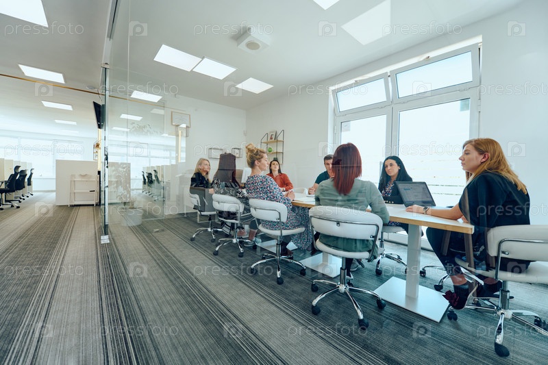 Разнообразная бизнес-группа обсуждает проекты в современном стеклянном офисе