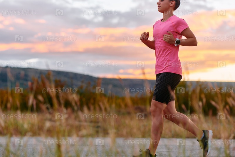 Решительный спортсмен бежит под солнцем на фоне прекрасной природы