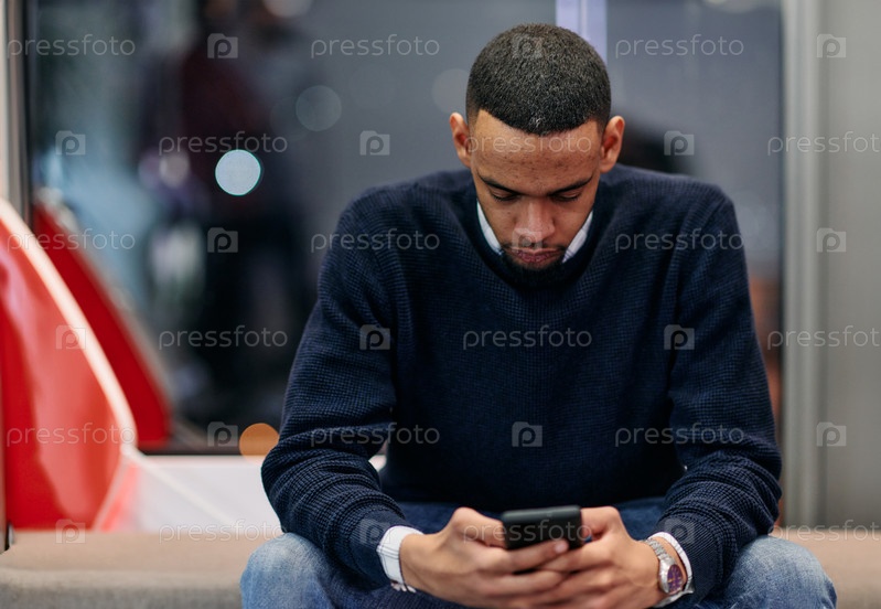 Молодой афроамериканец работает в коворкинг-пространстве, используя смартфон, анализируя тенденции онлайн-рынка, сосредоточенный мужчина-работник читает финансовые новости или просматривает интернет на телефоне. Концепция технологии