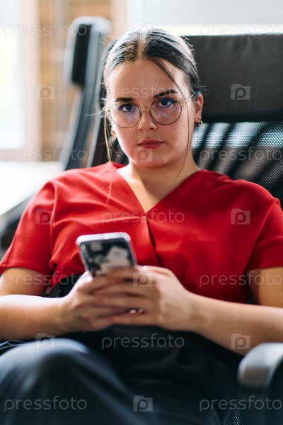 Бизнес-леди отдыхает во время короткого перерыва в работе в современном стартап-коворкинг-центре, используя свой смартфон, чтобы расслабиться и подзарядиться