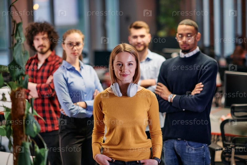 Портрет успешной творческой бизнес-команды, смотрящей в камеру и улыбающейся. Разнообразные деловые люди, стоящие вместе на старте. Избирательный фокус