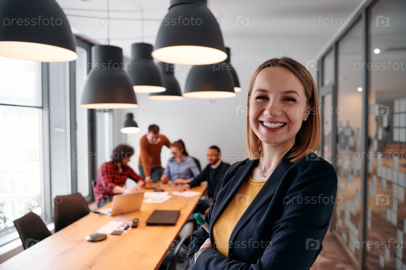 Уверенная в себе светловолосая бизнес-леди руководит командой в современной офисной обстановке