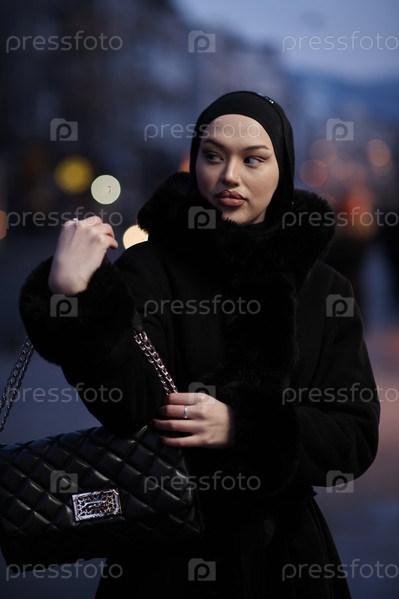 Мусульманка идет по городской улице холодной зимней ночью в хиджабе
