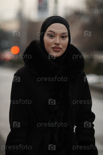 Мусульманка идет по городской улице холодной зимней ночью в хиджабе