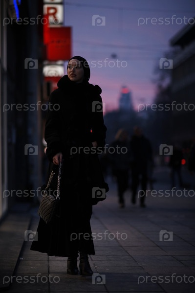 Мусульманка идет по городской улице холодной зимней ночью в хиджабе
