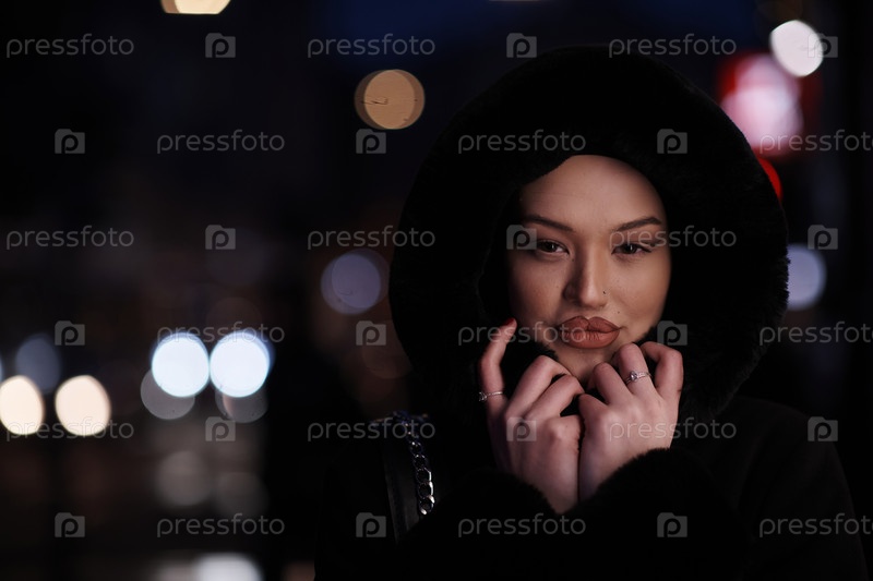 Мусульманка идет по городской улице холодной зимней ночью в хиджабе