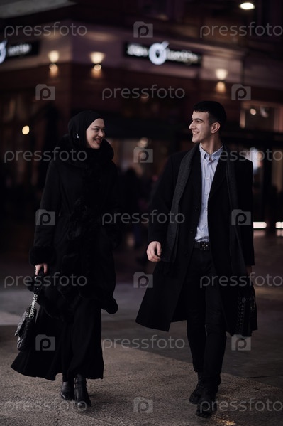Счастливая мультикультурная деловая пара прогуливается вместе на улице города ночью возле витрины ювелирного магазина
