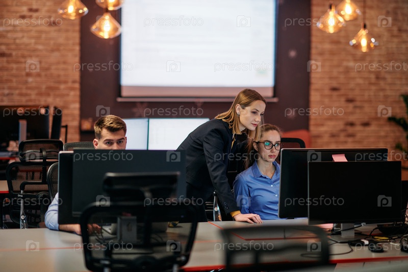 Стратегическая бизнес-встреча: группа профессионалов, работающих в офисе с использованием компьютеров