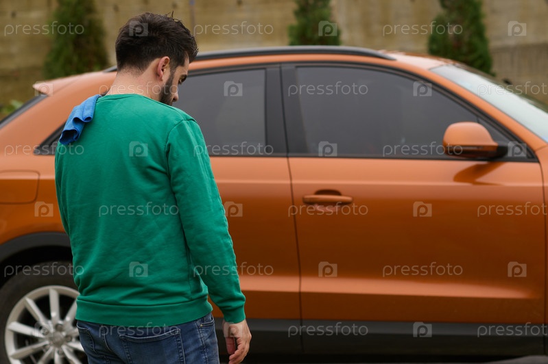 Мужчина тщательно моет и чистит свою машину на подъездной дорожке к дому, демонстрируя гордость за свое транспортное средство и прилегающую территорию