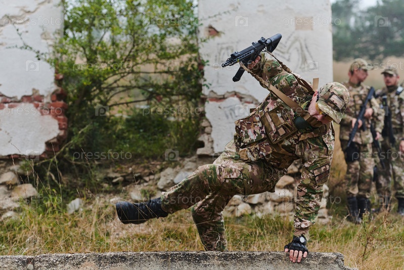 Высококвалифицированное элитное военное подразделение, одетое в камуфляж, умело перемещается по опасной лесной местности, преодолевая препятствия и выполняя точную и скрытную миссию