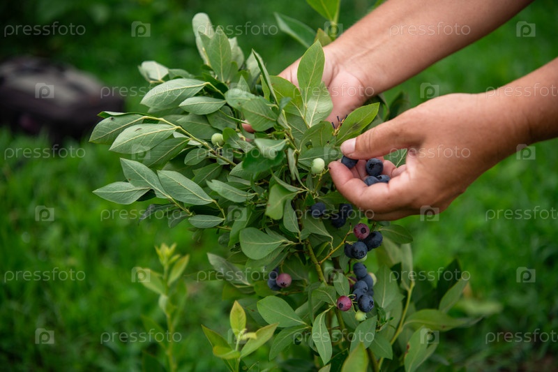 Крупный план женской руки, осторожно собирающей свежую чернику в залитом солнцем саду