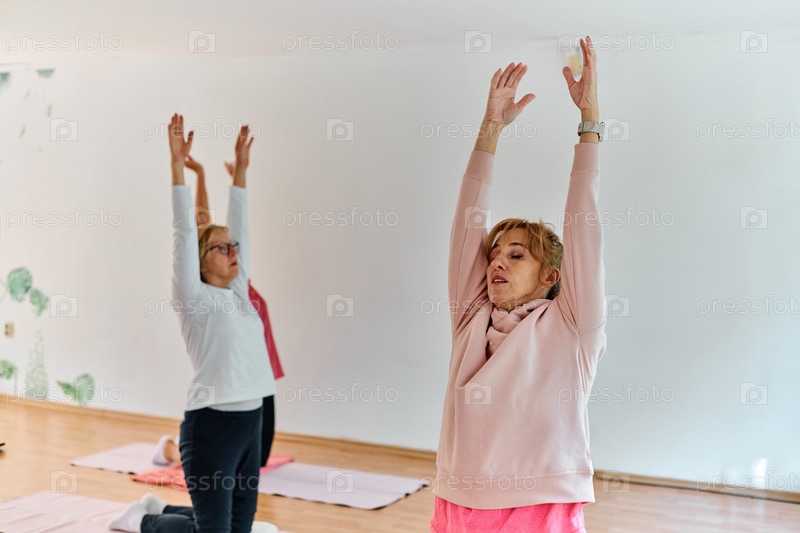 Группа пожилых женщин занимается различными упражнениями йоги, включая растяжку шеи, спины и ног, под руководством тренера в залитом солнцем месте, способствуя благополучию и гармонии