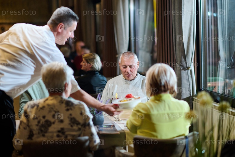 Вежливый официант безупречно обслуживает пожилую семью и их друзей, создавая дружественную атмосферу, когда они собираются за общим обедом, наслаждаясь разнообразными и изысканными блюдами современной кулинарии