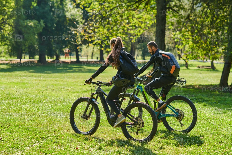 Счастливая пара, одетая в профессиональную велосипедную экипировку, наслаждается романтической велопрогулкой по парку, окруженному современными природными достопримечательностями, излучая любовь и счастье