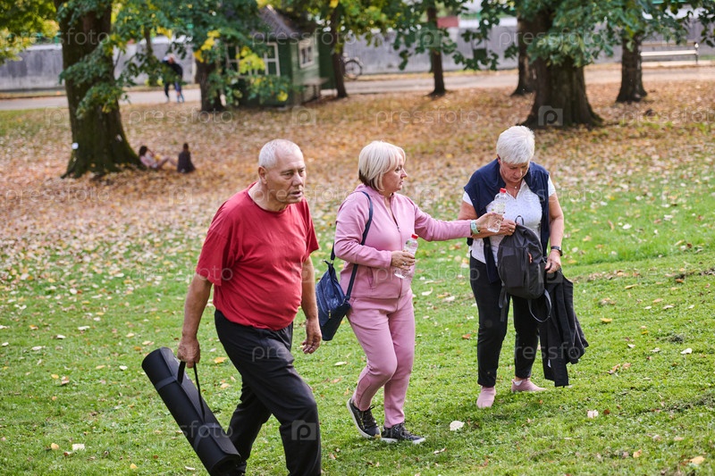 Группа друзей старшего возраста отдыхает на природе, укрепляя не только физическую форму, но и товарищество, а также общую приверженность поддержанию здорового и активного образа жизни в свои золотые годы