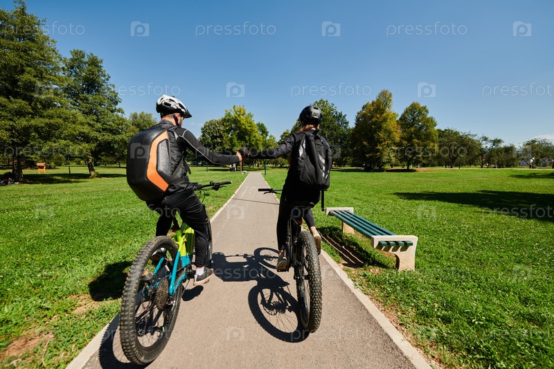 Милая парочка, одетая в велосипедную экипировку, едет на велосипедах, сцепив руки в романтическом объятии, запечатлевая суть любви, приключений и радости на залитой солнцем тропе