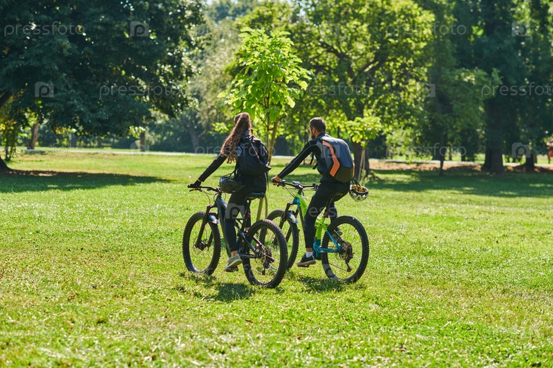 Счастливая пара, одетая в профессиональную велосипедную экипировку, наслаждается романтической велопрогулкой по парку, окруженному современными природными достопримечательностями, излучая любовь и счастье