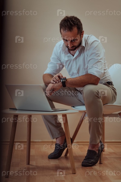 Уверенный в себе бизнесмен сидит с решительным выражением лица, используя ноутбук и смарт-часы, а бежевый фон подчеркивает профессиональную атмосферу, демонстрируя его производительность и опыт