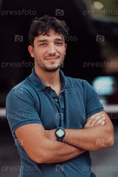 Портрет молодого успешного предпринимателя перед компанией