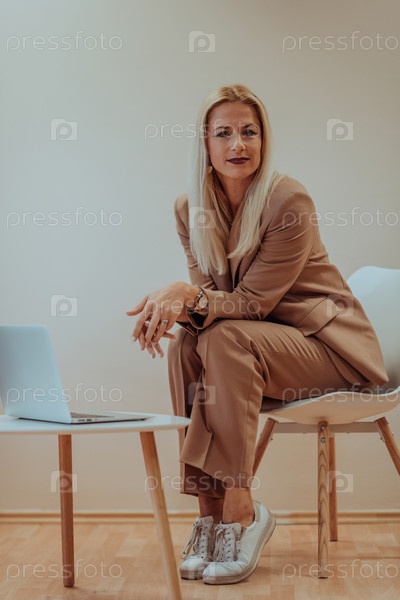 Профессиональная бизнес-леди сидит на стуле на спокойном бежевом фоне, усердно работая на своем ноутбуке, демонстрируя преданность делу и сосредоточенность на достижении успеха