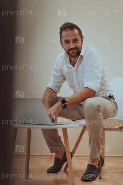 Уверенный в себе бизнесмен сидит и использует ноутбук с решительным выражением лица, а бежевый фон усиливает профессиональную атмосферу, демонстрируя его производительность и опыт