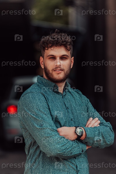 Успешный молодой бизнесмен в рубашке, скрестив руки, позирует на открытом воздухе с уверенным выражением лица