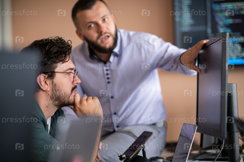 Программисты, погруженные в тесное сотрудничество, усердно работают вместе над решением сложных проблем