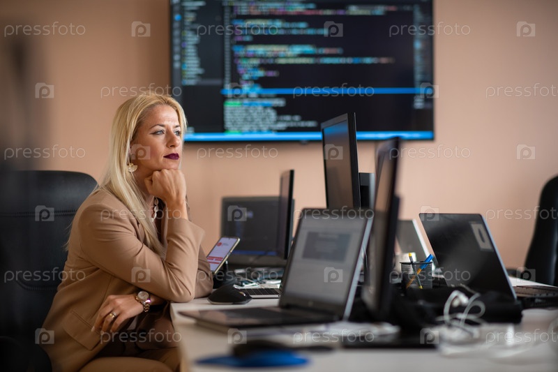 Бизнес-леди сидит в офисе программиста в окружении компьютеров