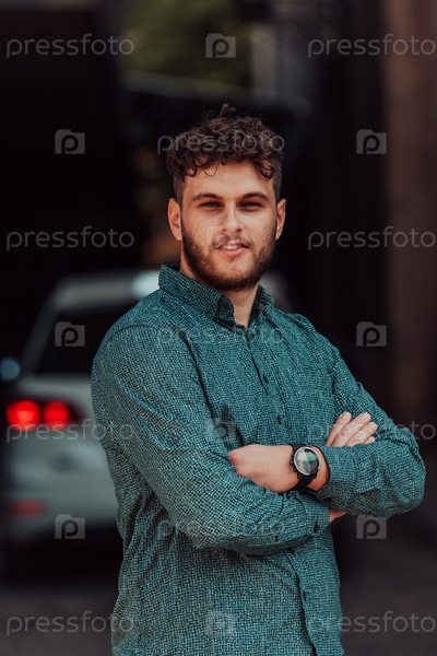 Успешный молодой бизнесмен в рубашке, скрестив руки, позирует на открытом воздухе с уверенным выражением лица