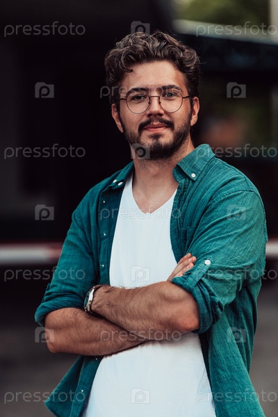 Успешный молодой бизнесмен в рубашке, скрестив руки, позирует на открытом воздухе с уверенным выражением лица