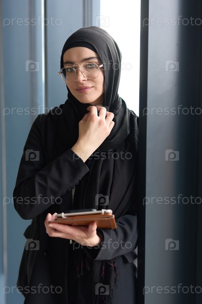 Великолепная мусульманка-бизнесмен запечатлена на портрете крупным планом, держа в руках планшет, демонстрируя свои пленительные зеленые глаза за стильными очками, излучающими элегантность, профессионализм и уверенность