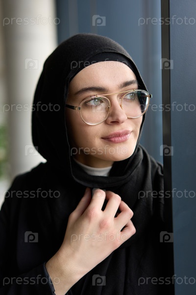 Великолепная мусульманка-бизнесвумен запечатлена на портрете крупным планом, демонстрируя свои пленительные зеленые глаза за стильными очками, излучающими элегантность и уверенность