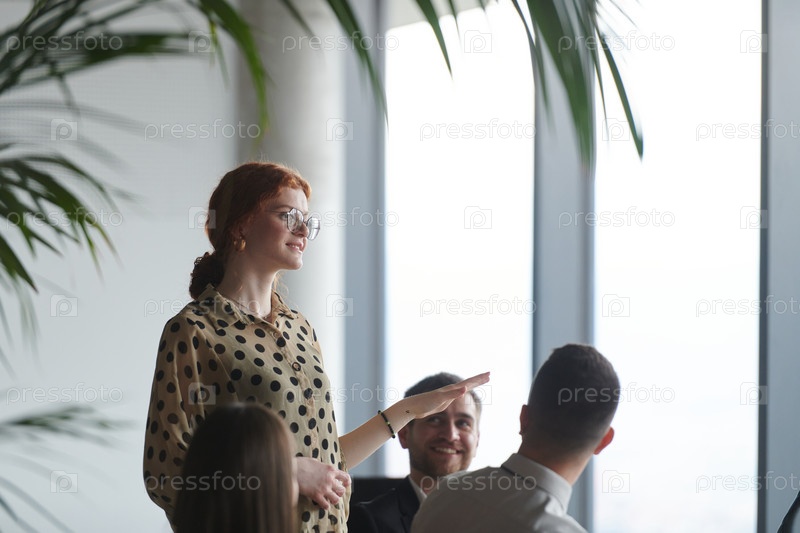 Разнообразная многонациональная бизнес-команда участвует в совместной встрече, обсуждая стратегии и решения в современной офисной обстановке