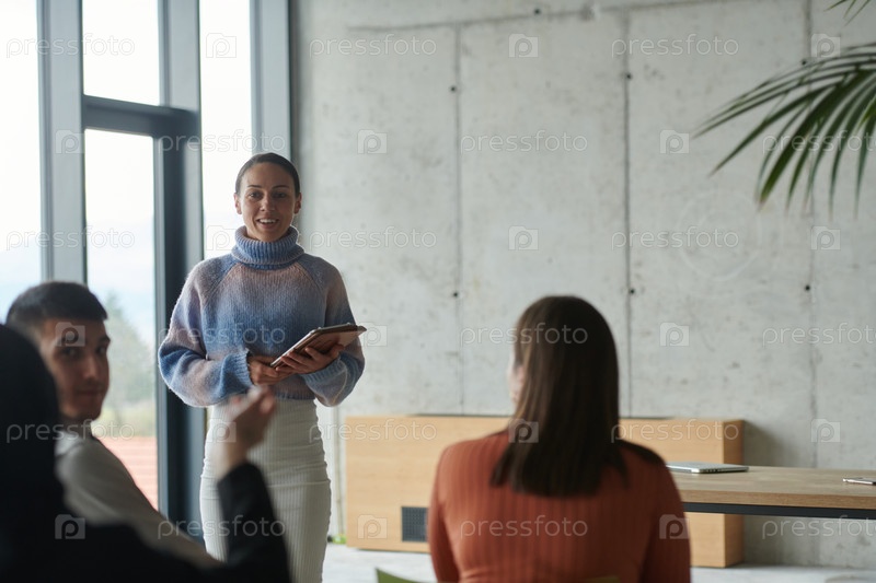 Разнообразная многонациональная бизнес-команда участвует в совместной встрече, обсуждая стратегии и решения в современной офисной обстановке