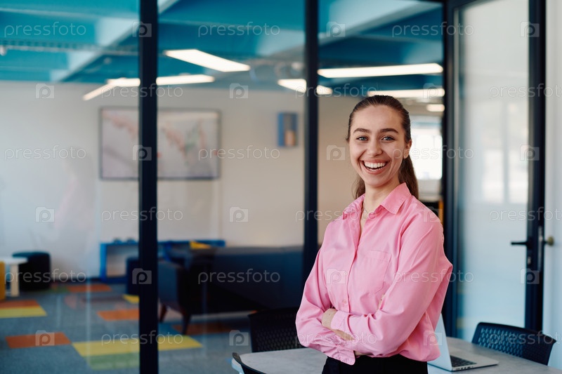 Портрет деловой женщины в креативном открытом пространстве коворкинга стартап-офиса со скрещенными руками. Успешная бизнес-леди стоит в офисе с копирайтом. На заднем плане работают коллеги