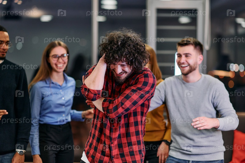 Группа молодых бизнесменов развлекается, играя в интересные игры, отдыхая от работы в современном офисе. Избирательный фокус
